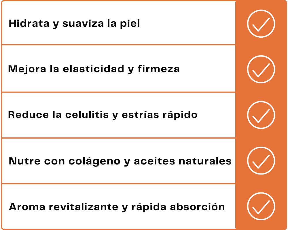 Los resultados pueden variar según tipo de piel y constancia en el uso. Para mejores resultados, se recomienda aplicar con masaje circular o con cepillo seco/masaje linfático, ayudando a que el aceite se absorba y a mejorar la elasticidad de la piel.